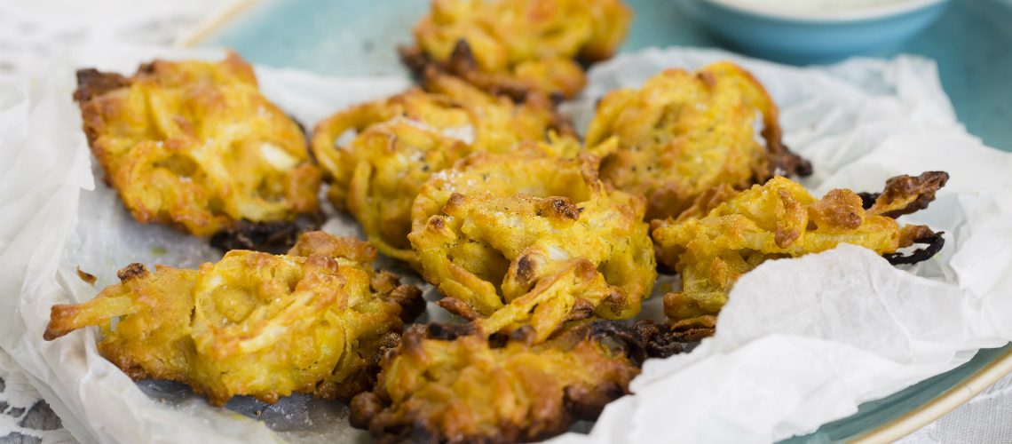 A sütőt előmelegítjük 180C (légkeverés). A hagymát felszeleteljük. Előkészítjük a tésztát: egy tálban simára keverjük a csicserilisztet, rizslisztet, sütőport, a fűszereket a vízzel és az olajjal. Beleforgatjuk a felszeletelt hagymát, hogy a massza mindenütt egyenletesen befedje. Egy tepsit leterítünk sütőpapírral, majd kanállal kis kupacokat halmozunk a masszából. Meglocsoljuk kevés olajjal. Kb. 25 perc alatt aranyszínűre, ropogósra sütjük. Közben elkészítjük a chutneyt, amihez az összes hozzávalót egy aprítógépben pürésítjük.