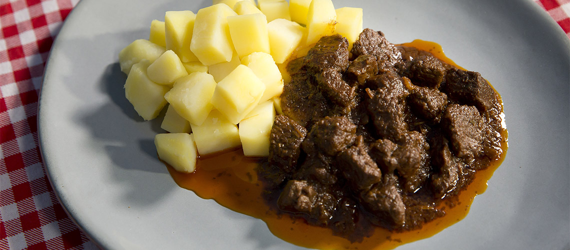 A hús főzése: visszatesszük a pirított szarvashúst az alaphoz. Addig kevergetjük, amíg levet nem enged. Ha szükséges, kevés vízzel pótoljuk. Lefedve, lassú tűzön 3–4 órán át főzzük, amíg a hús teljesen megpuhul. Időnként keverjük át. A maradék fokhagymát a főzés utolsó 30 percében adjuk hozzá.