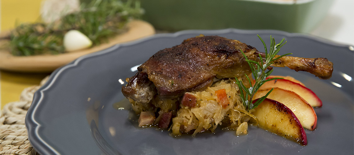 A kacsacombokat sózzuk, borsozzuk és szeletelt vöröshagymával sütőben ropogósra sütjük. A kockázott szalonnát zsírjára pirítjuk, majd kevés cukrot karamellizálunk rajta. Rátesszük a savanyított káposztát, a darabolt paradicsomot és fűszerezzük babérlevéllel, köménnyel, borssal, borsikafűvel, fűszerpaprikával. Sózzuk és fehérborral, vízzel felöntve puhára főzzük. A szeletelt, magozott almát megpirítjuk, majd kevés mézzel néhány percig pároljuk. Tálalás előtt sütőben a káposztát a kacsacombokkal egybesütjük és ízlés szerint, mézesen karamellizált almával kínáljuk.