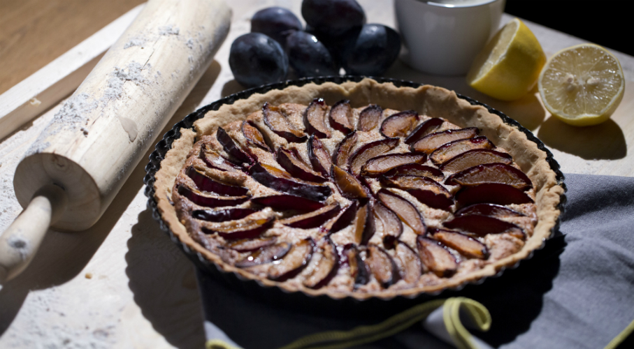 A tésztához a vajat apró kockákra vágjuk, egy nagyobb tálban összemorzsoljuk a liszttel és a sóval. Annyi vizet adunk hozzá, amitől ruganyos, nem ragacsos lesz. Gyorsan összegyúrjuk, fóliába tekerjük és 1 órára a hűtőbe tesszük. Kinyújtjuk kerek piteformába terítjük, megszurkáljuk és visszatesszük a hűtőbe újabb 1/2 órára. A sütőt közben 180-200 fokra melegítjük. A tésztára sütőpapírt teszünk, erre lencsét nehezéknek és jó 10 percig sütjük, majd levesszük róla a papírt és a lencsét és újabb 5 percig sütjük. A töltelékhez a mandulát ledaráljuk a cukorral, hozzáadjuk a szilva kivételével az összes többi hozzávalót és tovább daráljuk késes robotgépben. A tölteléket az elősütött tésztára kenjük. A szilvákat félbevágjuk, kimagozzuk, vékony szeletekre vágjuk és legyezőszerűen a süteményre helyezzük. 25-30 perc alatt készre sütjük. Akkor jó, ha a töltelék felemelkedik, a gyümölcs pedig megpuhul. Teljesen kihűtjük szeletelés előtt. A hideg habtejszínt felverjük, először lassan, majd fokozatosan egyre gyorsabban. Közben hozzáadjuk a cukrot és a vaníliakivonatot.