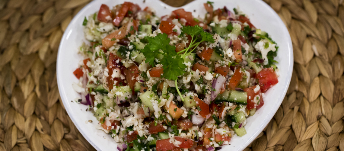 Az uborkát, a paradicsomot és a lilahagymát apró kockákra felvágom. Egy nagy tálban összekeverem. A nyers karfiolt erre ráreszelem. A dresszinghez mindent alaposan összekeverek egy kis csészében. A zöldfűszereket egészen apróra vagdosom, majd összeforgatom az alapanyagokat és megszórom az aszalt áfonyával.Meglocsolom az öntettel, ismét fellazítom a villámmal, és frissiben tálalom.