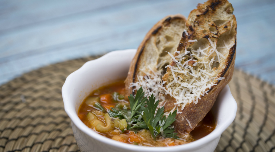 Egy edényben megpirítjuk az aprított hagymát és fokhagymát. Hozzáadjuk a kockára vágott sárgarépát és fehérrépát. Egy kicsit pároljuk. Ezután felöntjük az alaplével, és 5 percig főzzük. Hozzáadjuk a darabokra vágott cukkinit, a szárzellert és a zöldbabot. Megvárjuk, hogy a leves újra felforrjon, kicsit forraljuk, majd hozzáadjuk a paradicsompürét és puhára főzzük a zöldségeket. Sóval, borssal és friss bazsalikommal ízesítjük. Pirított ciabattával és reszelt parmezánnal kínáljuk.