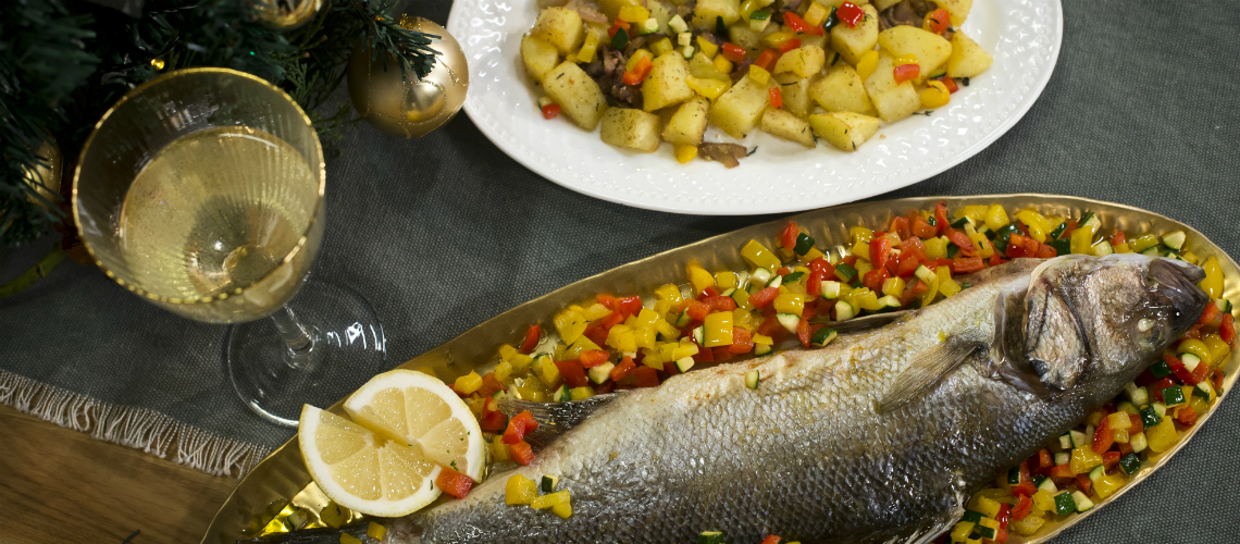 A halat fűszerezzük egy citrom héjával, olajjal, fehér borral, kakukkfűvel, oregánóval, fokhagymával, sóval, fehér borssal, a sütőbe helyezzük 30-40 percre, 180 fokon. Minden hozzávaló zöldséget kockákra vágunk (a cukkini magját eltávolítjuk), kakukkfűvel és fokhagymával pároljuk röviden őket. Egy lábosba odatesszük főni a kockára vágott krumplit, 3-4 percre. Egy tepsi alját megkenjük olajjal, ráhelyezzük a krumplit, majd betesszük a sütőbe. Olajban megpirítjuk a finomra vágott lilahagymát, a zöldségeket is kicsit megpirítjuk, ízesítjük kakukkfűvel, sóval. 5 perccel azelőtt, hogy elkészülne a krumpli, prézlit és a lila hagymát is hozzáadjuk. A felkockázott zöldségeket 180 fokon 5 percre szintén a sütőbe helyezzük.