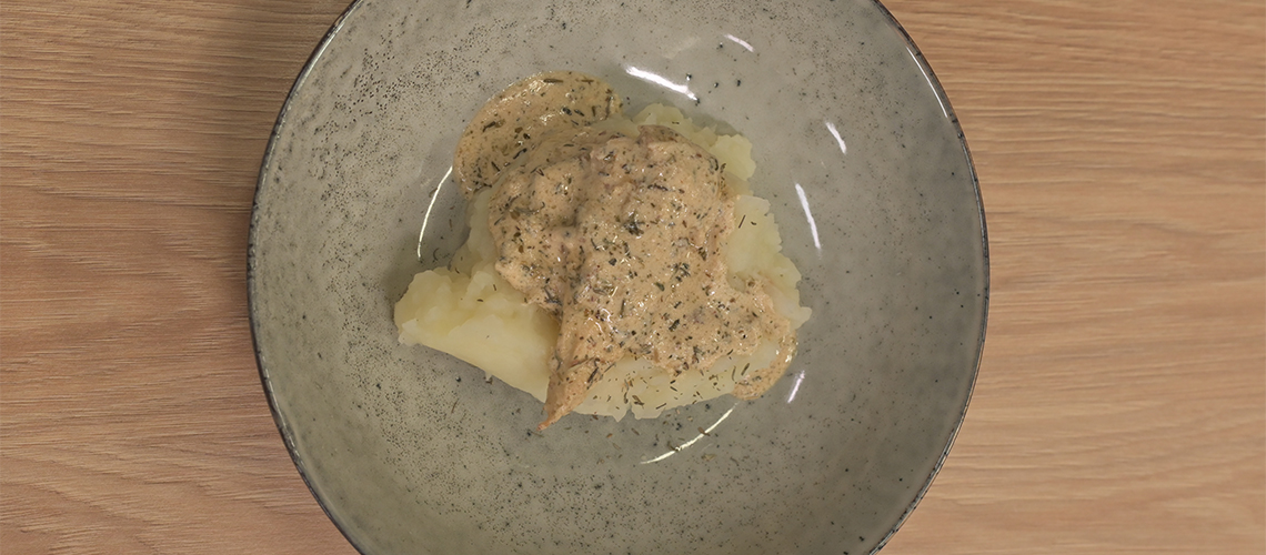 A csirkemellet tenyérnyi, fél tenyérnyi szeletekre vágjuk. Besózzuk és az egyik oldallal elkezdünk pirítani, a másik felét Maille dijoni mustárral bekenjük, majd a mustáros felével lefelé fordítva is sütjük, és ha már kicsit odakapott, felszedjük a kakukkfűvel elkevert tejföllel. Vízzel kicsit hígítjuk, és fedő alatt szósszá főzzük.