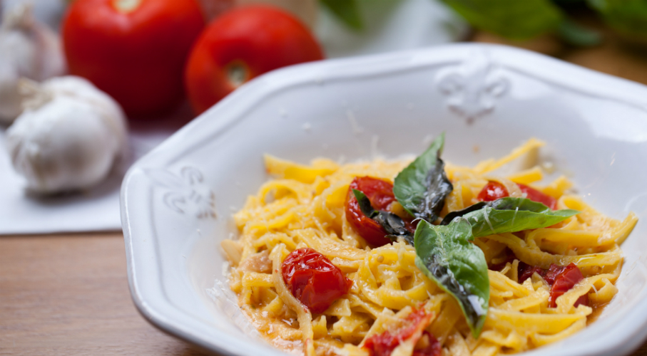 A paradicsomokat félbe vágjuk és egy edénybe helyezzük. Megszórjuk sóval, cukorral és kakukkfű levéllel, majd meglocsoljuk olívaolajjal. Előmelegített sütőben 190 fokon 15 percig sütjük. Egy nagyobb serpenyőben kis lángon felmelegítünk egy kevéske olívaolajat, majd megpirítjuk rajta a szeletekre vágott fokhagymát. Figyeljünk, nehogy odaégjen. Hozzáadjuk a megsütött paradicsomokat, majd összepirítjuk és meglocsoljuk borral. Ízesítjük. Közben egy nagy fazékban sós vízben 2-3 perc alatt al dente-re főzzük a tésztát. Leszűrjük, majd a főzővízből egy keveset a szószhoz adunk. Ismét megkeverjük. Végül a tésztát a szószba tesszük, és összekeverjük bazsalikom levelekkel. Frissen reszelt parmezánnal azonnal tálaljuk.