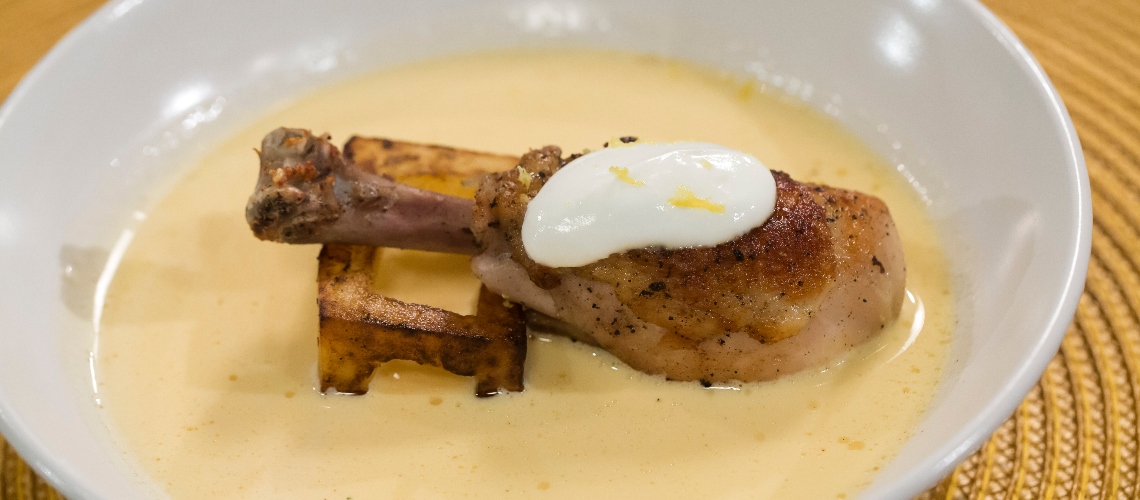 A krémes levesalaphoz: a tojássárgáját felverjük egy kis citromlével, hőkiegyenlítéssel hozzáadjuk az alaplevet. Az alapléhez egy szűrőn keresztül hozzáöntjük a húsból kisült lé felét és egy kis tejszínt.  A rizst puhára főzzük és hozzáturmixoljuk az alapléhez.