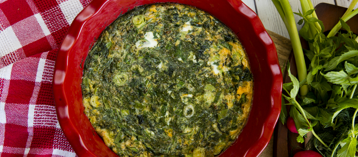 A sütőt előmelegítjük 200c fokra. Egy nagy serpenyőben felhevítjük az olívaolajat, majd puhára dinszteljük rajta a felkarikázott újhagymát. Rádobjuk az összes felaprított zöldfűszert, és néhány percig kevergetjük. A tojásokat felverjük, sózzuk, borsozzuk, majd egy keverőtálban összekeverjük a dinsztelt zöldfűszerekkel (zöld színű masszát kapjunk, soknak fog tűnni a fűszer aránya, de ennek ilyennek kell lennie). Kb. 25 percig sütjük, amíg megszilárdul.