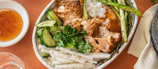 Rizs bowl pácolt lazaccal, spárgával