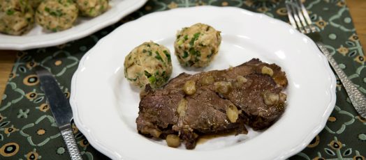 Lassan sült marhanyak zöldfűszeres maceszgombóccal