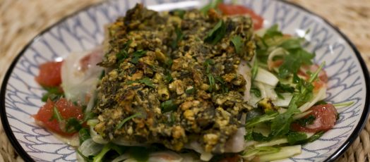 Tőkehal kesudiókrusztával, édesköményes-grapefruit salátával