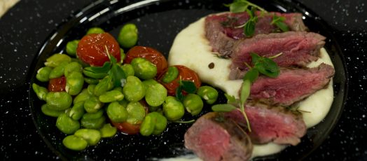 Marhabélszín kakukkfüves burgonyapürével és lóbabos sült paradicsommal