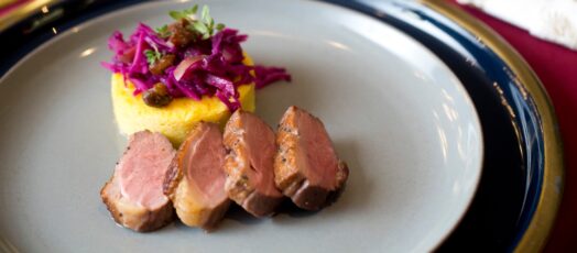 Rozé kacsamell almás lilakáposztával, juhtúrós puliszkával és kacsatepertővel