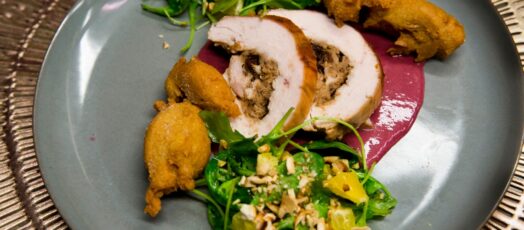 Szilvával-gesztenyével töltött pulykamell, szilvamártással, szerecsendiós zellerkrokettel, rukkolás narancssalátával