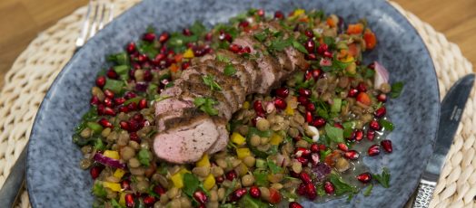 Gránátalmás-zöldséges lencsesaláta kacsamellel