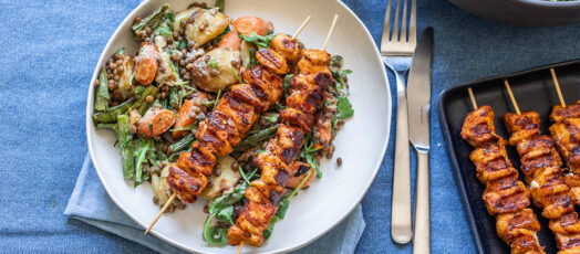 Sült zöldség saláta lencsével és pácolt csirkenyárssal