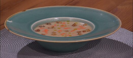 PÓRÉHAGYMÁS KRUMPLILEVES, (VICHYSSOISE) KÁPIA PAPRIKA KRÉMMEL ÉS KRUTONNAL